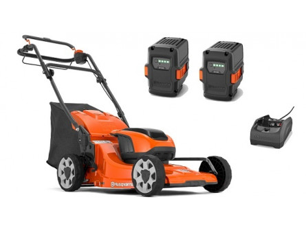 Tondeuse batterie Husqvarna LC 142 iS tractée avec 2 batteries 40-B140 et chargeur 40-C80. Autonomie prolongée, confort optimal et coupe 42 cm. Idéale pour jardins moyens.